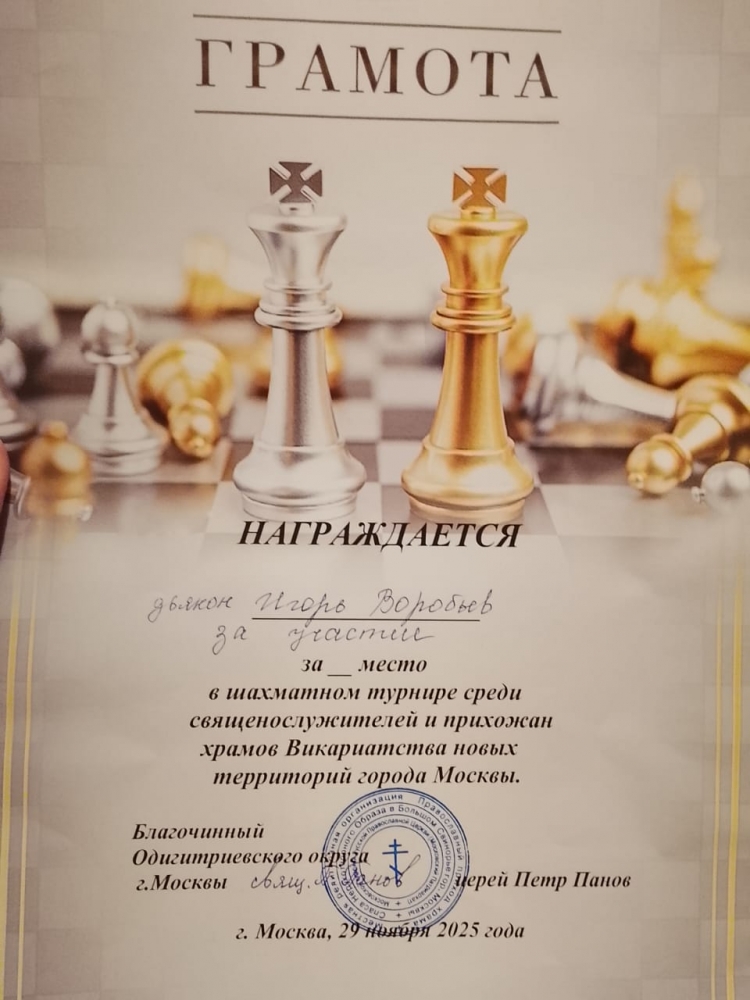 Клирик храма Покрова Божией Матери на Десне диакон Игорь Воробьев, а так же прихожане Покровского храма приняли активное участие в Турнире.отец Игорь набрал 3,5 очка из 5 очков, алтарник храма Курланов Роман 3 из 5, воспитанники Десеновской Православной школы Аникеев Иван, Терлецкий Арсений, Медведев Александр, Кузьменко Владимир, Грунин Демид и Макеев Александр так же набрали достойное колличество баллов на данном соревнование!